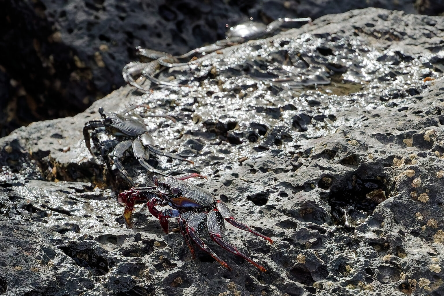Dann kommen Muster im Sand zum Vorschein oder Krabben und Krebse kommen aus ihren Verstecken und auch die Steine und Felsen am Ufer sind besonders gut sichtbar. Die pralle Sonne hatte auch Vorteile: es war hell. Während sonst schwarze Krebse auf schwarzen Steinen zu einer Herausforderung werden, war es dieses Mal sehr einfach, diese Tiere zu fotografieren. Es war hell genug, um bei maximaler Brennweite des Objektivs (135mm auf APS-C) und Blende 8 bis sogar 10 niedrige ISO-Werte und kurze Belichtungszeiten verwenden zu können.
